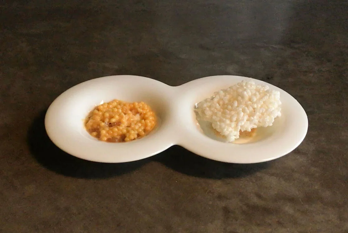 オランダbyFlow社の3Dフードプリンターで1.8mm巾のメレンゲを積層。中空のメレンゲに飴細工で蓋をした上にナッツのクランチを載せました。メレンゲ、飴、ナッツのクランチというそれぞれ固さの異なる素材が同時に口の中で崩壊していく食感をお楽しみください。まだまだこれからの分野です が、人の手では作れない形をベースに、デザイナーとパティシエが共同で想像力を形にしたスイーツです。