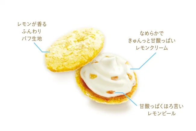 ふわっと軽いパフのようなレモン生地と、なめらかで甘酸っぱいレモンクリーム、おまけにほろ苦いレモンピールのアクセント。レモンの香りと、口の中でやさしくとけあう心地よい食感にこだわった、さわやかなレモンクリームサンドです。