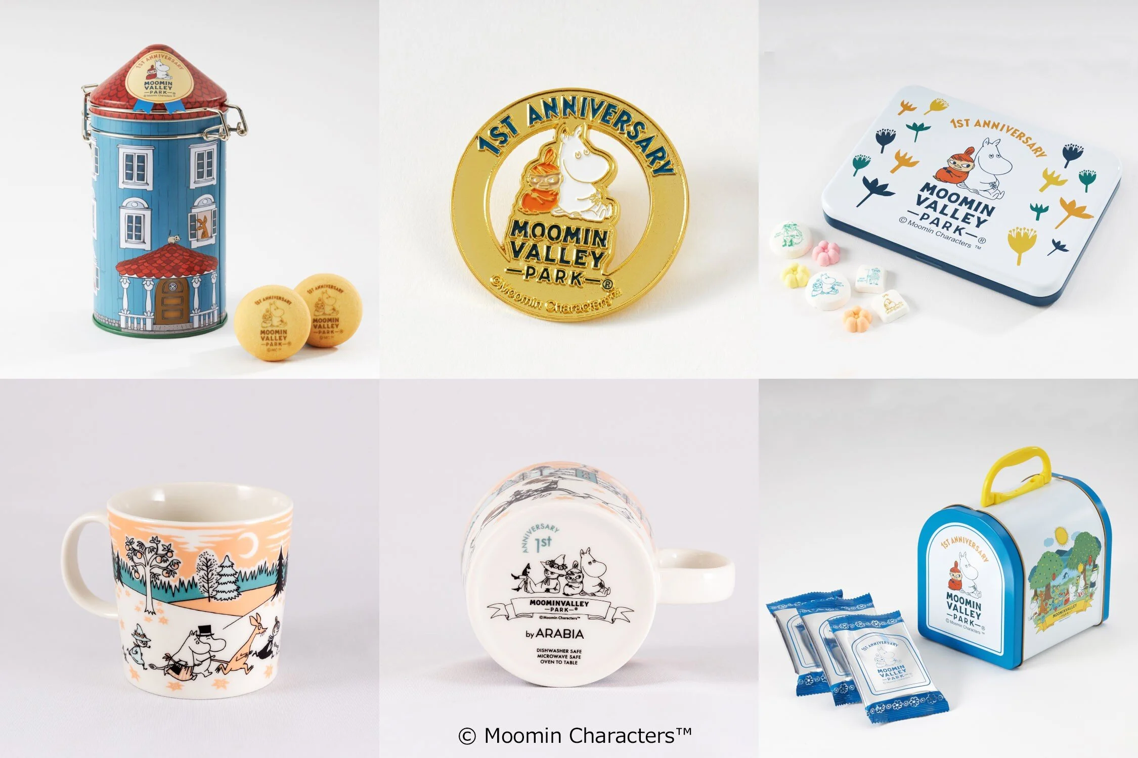 <画像下段左から>ムーミンバレーパーク限定マグ by アラビア、同商品裏面(1周年限定デザイン)、ラスク
