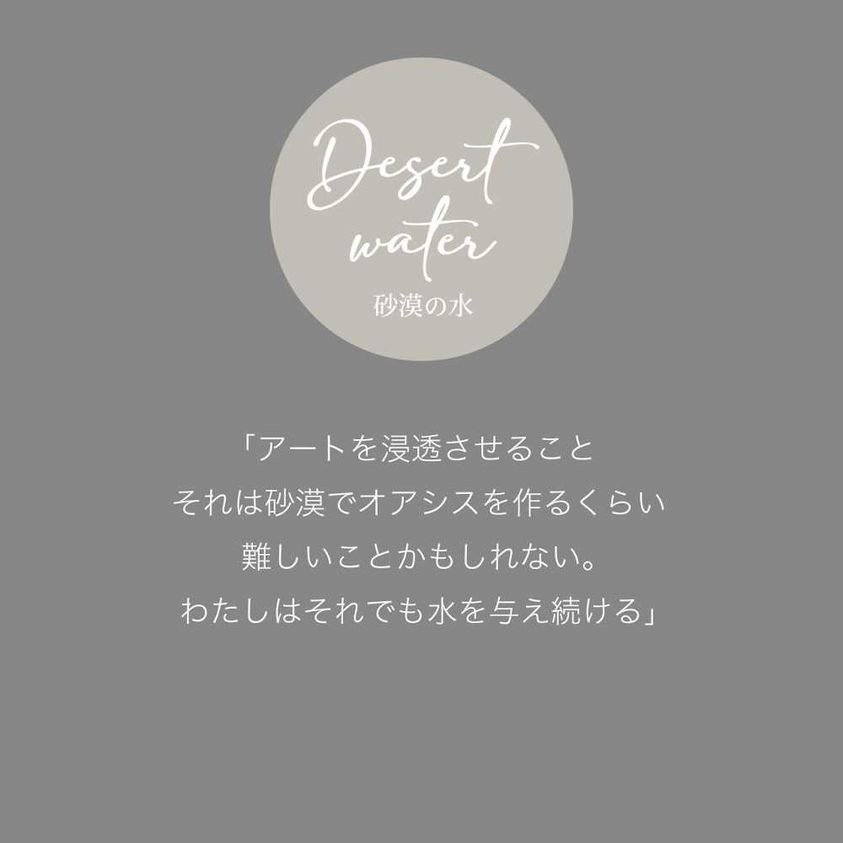 アーティスト稲葉怜を中心に、若手アーティストが集まり立ち上げたアートプロジェクトです。砂漠の水は、まだ知られていない素晴らしい作品を制作する、才能あるアーティストの活動を応援しています。
