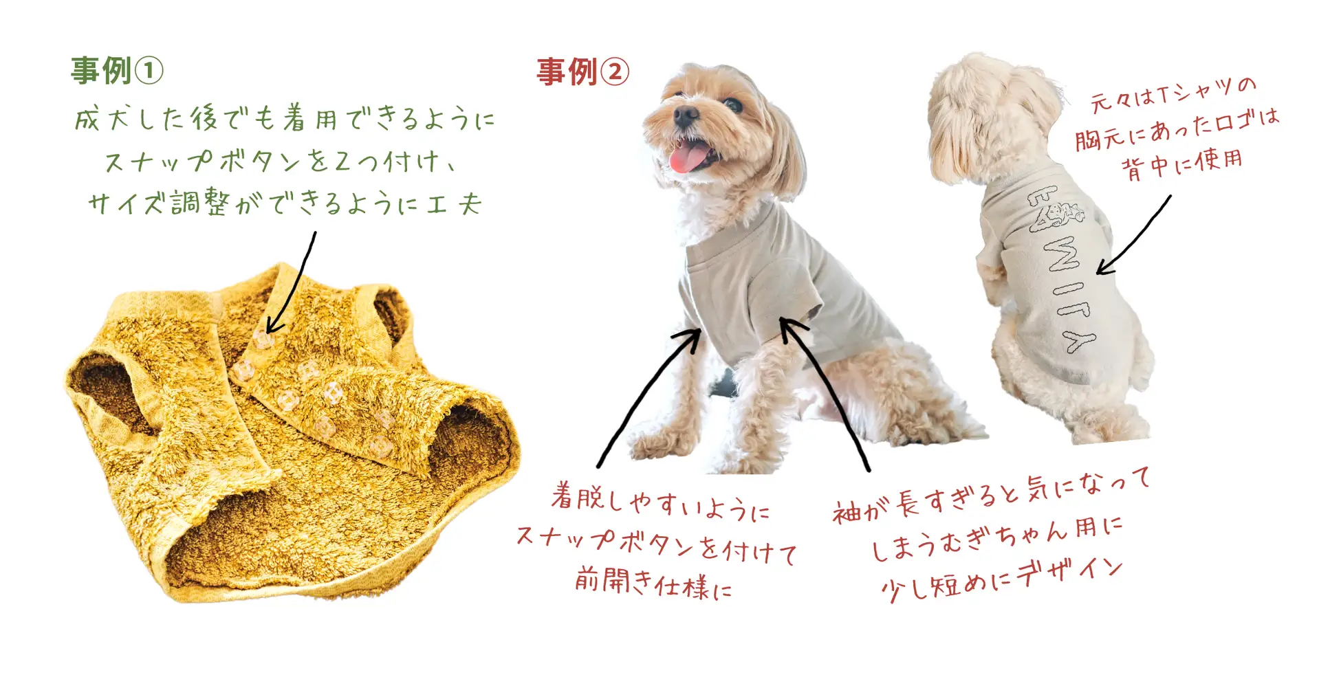 愛犬のサイズに合わせて制作できることはもちろん、「着脱しやすいようにボタンを付けて、前開きの仕様にしたい」「毛が多いのでお腹周りは大きめにしたい」などお客様のご要望に合わせてリメイクを実施していきます!