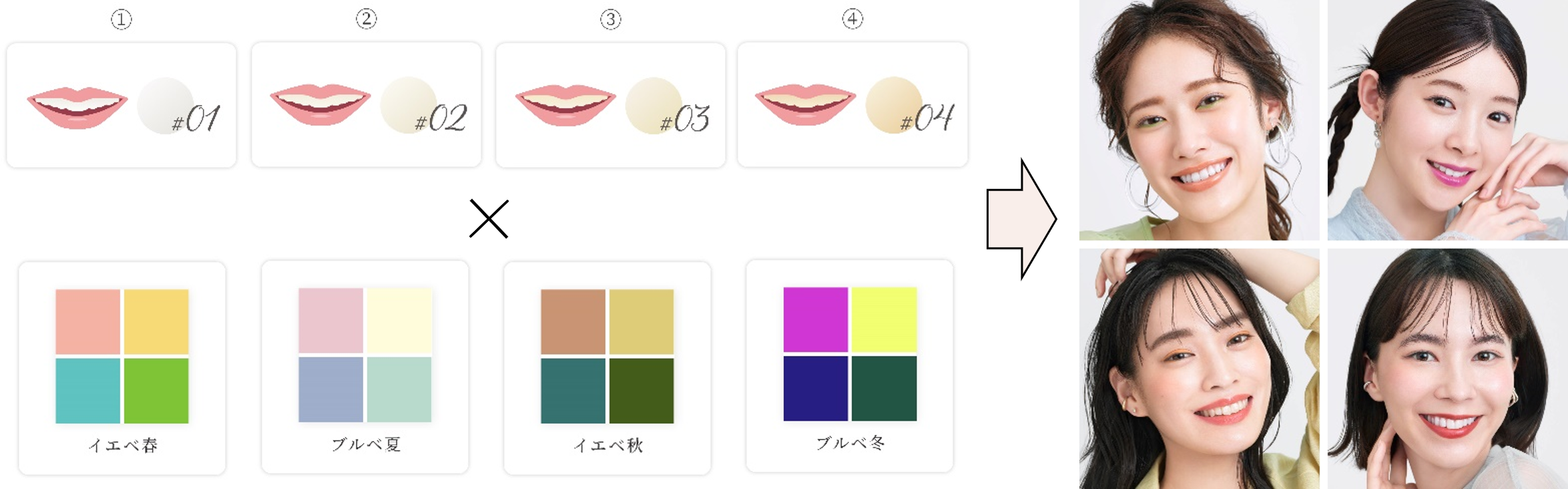 Lightee SMILE MAKEUP特設サイトでは、歯の色はご自身で前歯の色を鏡でチェックし、4つの色から選択できます。また、パーソナルカラーについては、サイト内に自身のパーソナルカラーを簡易チェックできるチャートをご用意しており、4つの質問に答えるだけで、ご自身に合うパーソナルカラーを「イエベ春」、「ブルベ夏」、「イエベ秋」、「ブルべ冬」の4種類のうちどれに当てはまるかを把握することが可能です。