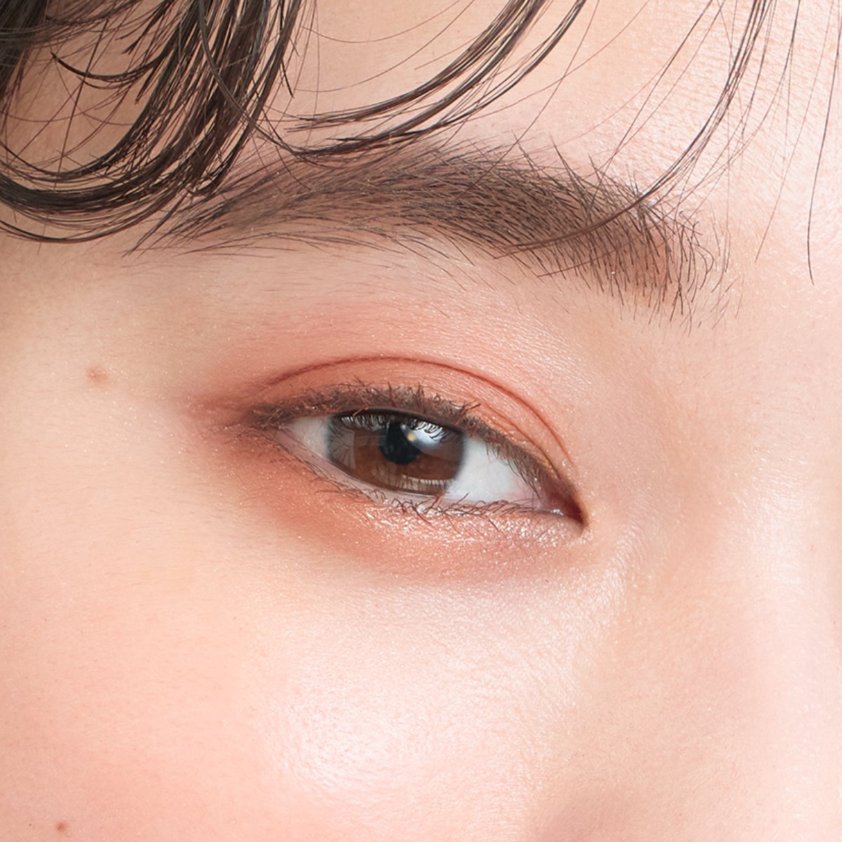 テラコッタカラーを二重幅に塗布します。アイラインのように囲うことで目に力を出しましょう。アイライン、マスカラともにブラウンをチョイス。ラメはシアーな質感のものを選び、目の下に塗布しましょう。