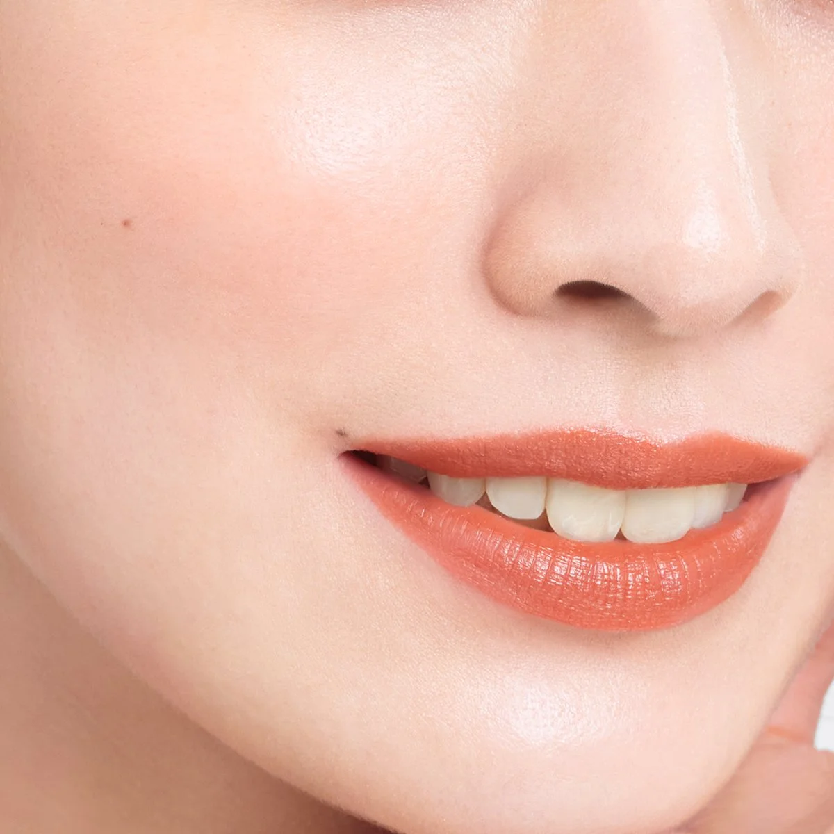 テラコッタカラーでリップを描きましょう。少し赤みのあるブラウンなので、歯の色を明るく見せてくれます。少しオーバーぎみにハーフマットの質感に仕上げることで、旬顔に。またチークは、テラコッタカラーを“つなぎメイク”で頬ぼねに。中心より頬の高さに合わせて塗布しましょう。