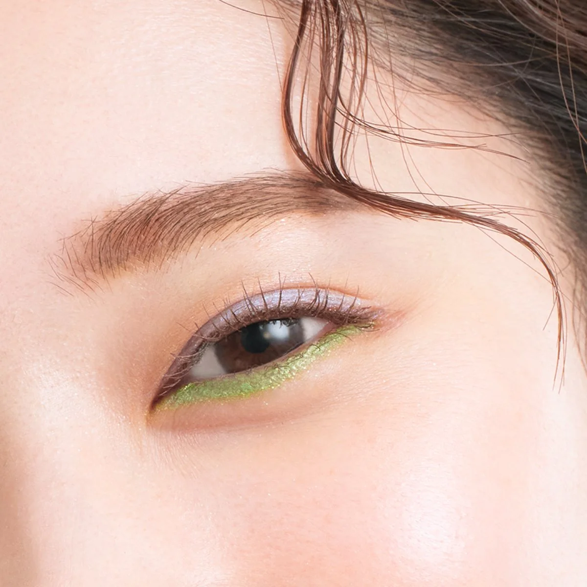 グリーンのラインを目の下の粘膜付近に入れることで発色させ、抜け感を出し、なじみを良くします。上まぶたには、薄いグリーンでラメを混ぜたカラーを塗布。グリーンを使う事で、“シティ感”を簡単に出すことができます。