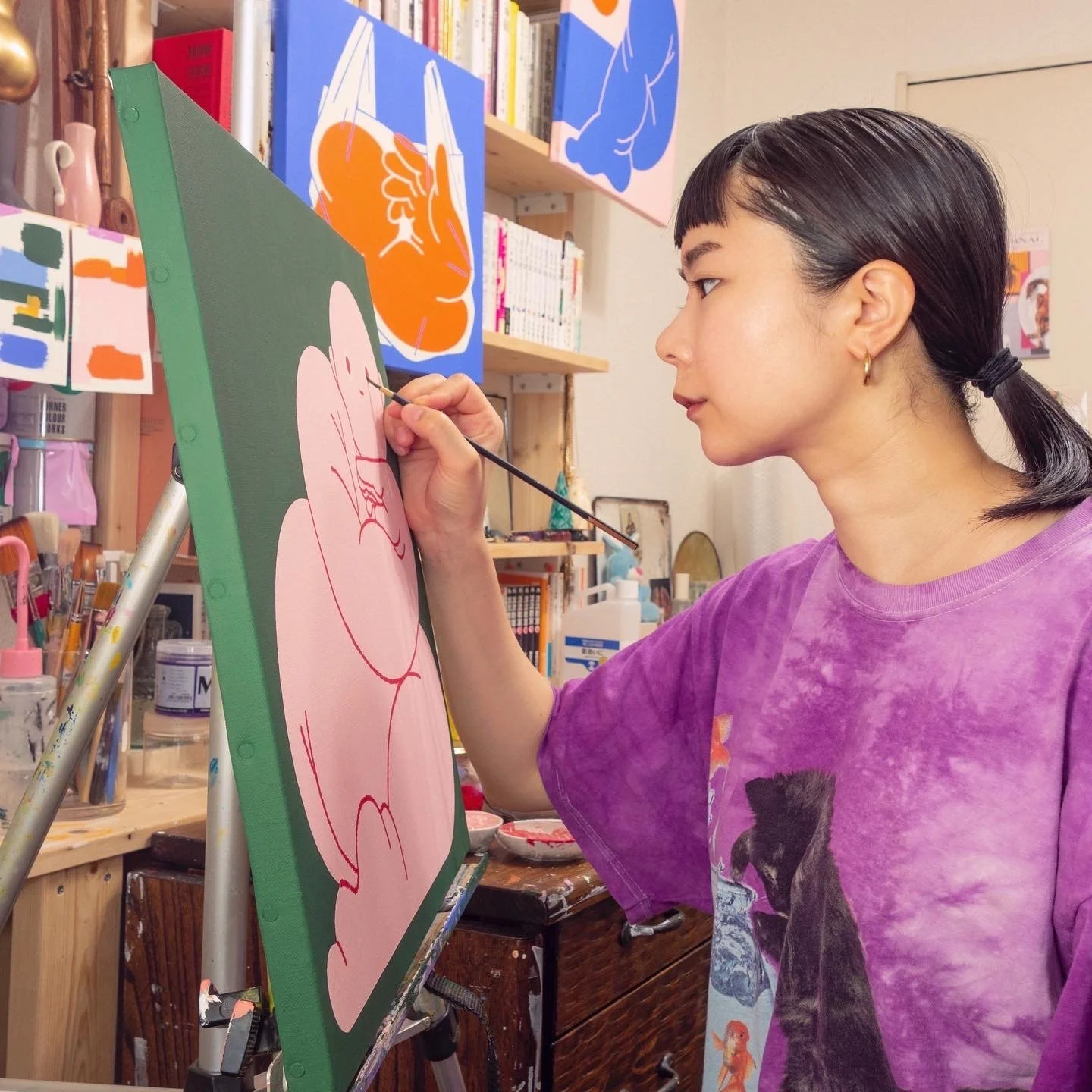 1993年東京都出身。2020年からイラストレーター・アーティストとして活動を始める。幼少の頃から習っていたモダンダンスやジャズダンスの影響で身体を使った表現に関心を持ち、身体の伸縮によって生まれる張りやシワの美しさに着目したふくよかな体型の人物を描いている。開放的なキャラクターたちがユーモラスに描かれる作品に海外からのオファーも急増。韓国でのアートフェア出展が決定するなど、その活躍を世界へと広げている。