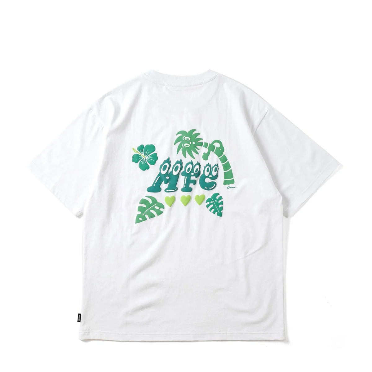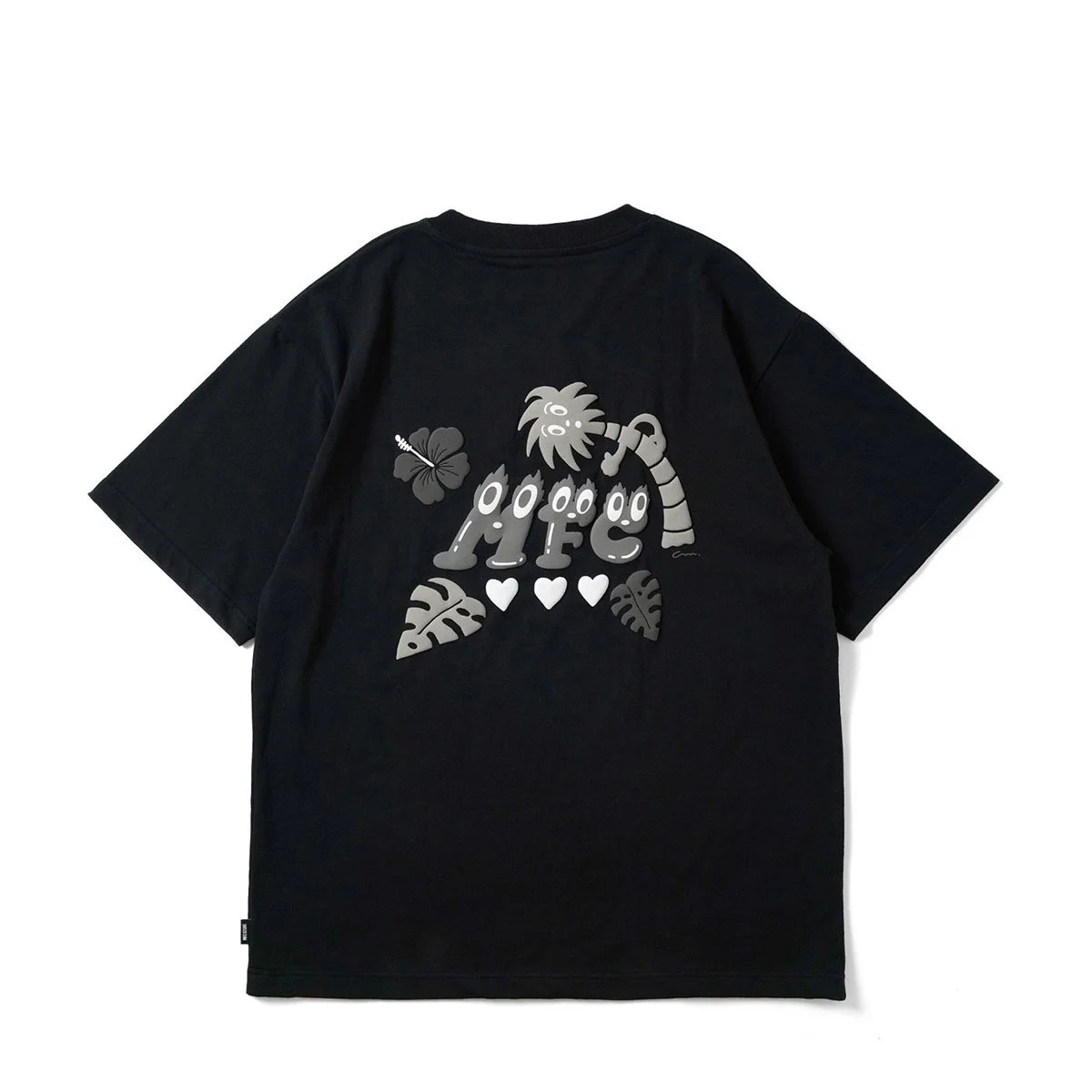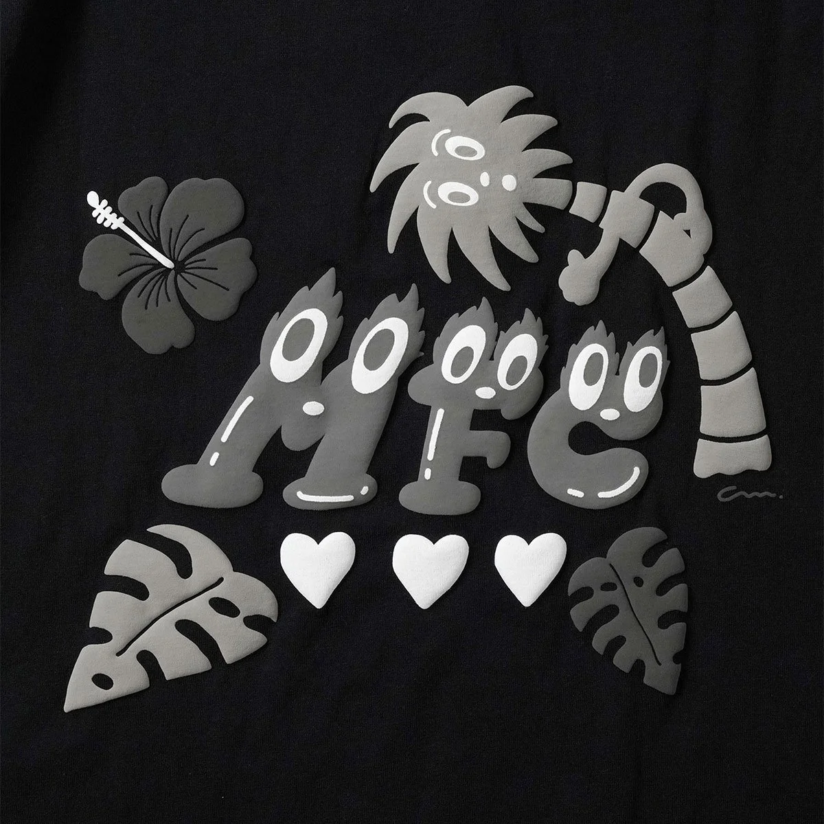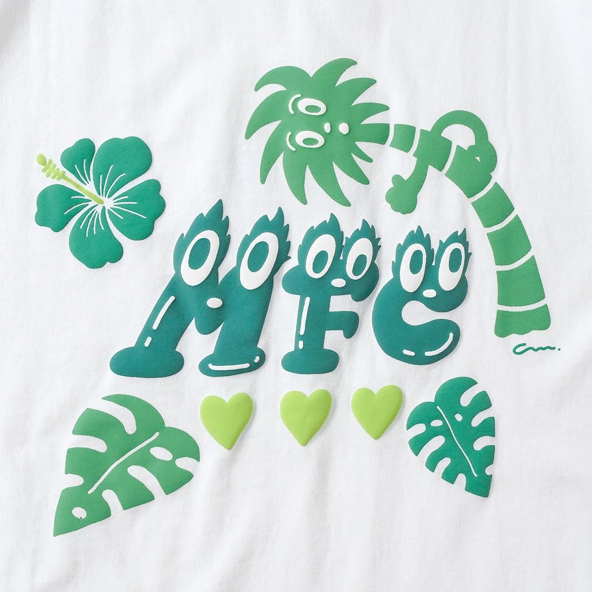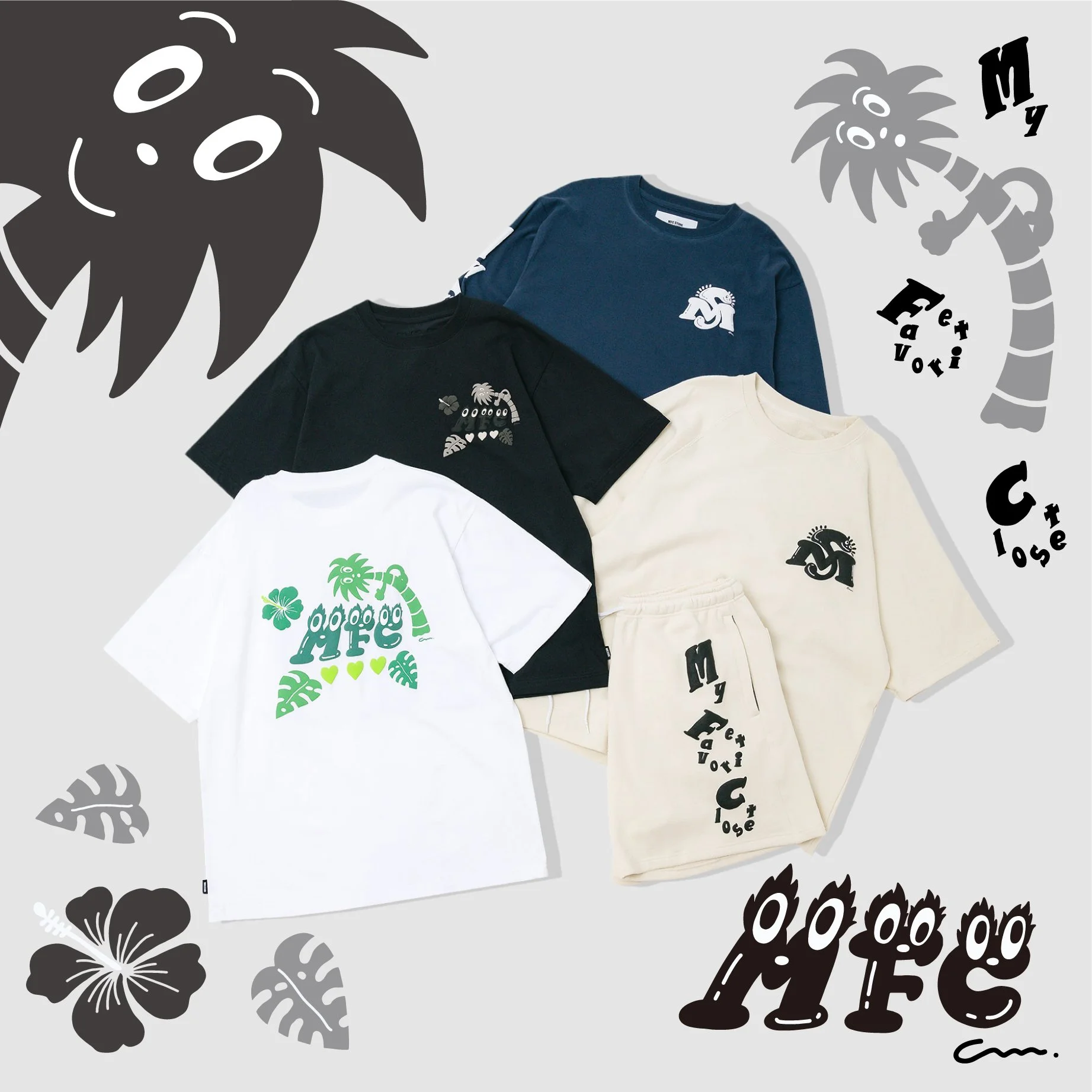 本コラボレーションでは、Chocomoo⽒が描いたイラストを⽴体的な発泡プリントで落とし込んだTシャツ2型とロングスリーブTシャツ、スウェットのセットアップの全5型を展開します。MFC STOREのコンセプトである“My Favorite Closet”や「MFC STORE×Chocomoo」のコラボレーションロゴ、夏のハワイを彷彿させるイラストなどを配したコラボレーションならではのラインアップ。
