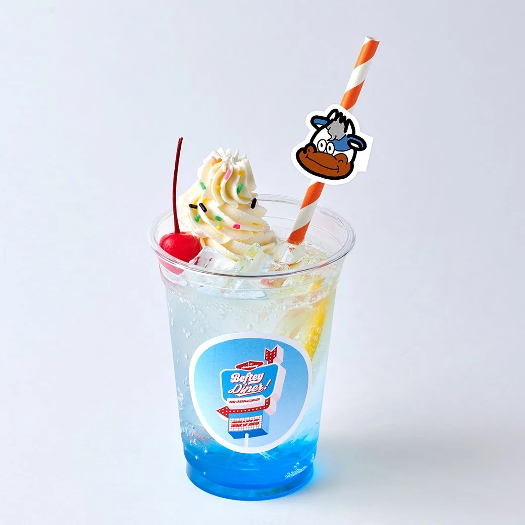 ウシくんの故郷は果たして!?北海道産濃厚ミルクのホイップとカラフルなトッピングが添えられた、「BEFTEY DINER」をイメージさせるPOPなカラーが特徴のソーダドリンク。意味深な表情を浮かべるウシくんのオリジナルストローチャームにも注目。