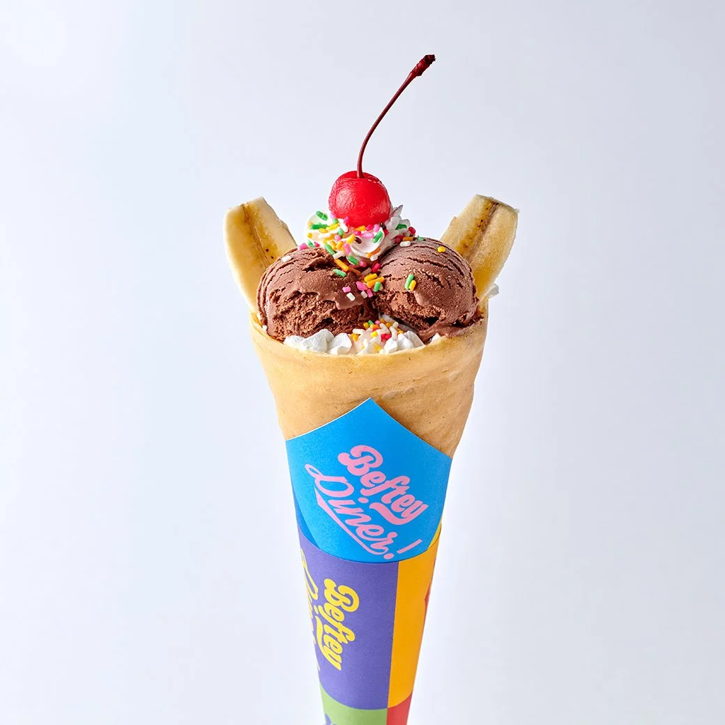 ウシくんの念願叶い実現した角クレープは、2つのチョコアイスから2本のバナナホーンが生えた特製クレープ。ほかにも、生クリームとチョコソース、さくらんぼがトッピングされ、ちょっとレトロな「BEFTEY DINER」の味が楽しめる一品です。