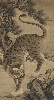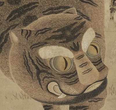まんまるまなこに三日月型の瞳孔、ふさふさした眉、S 字型にカーブする口元、 やわらかそうな足。琉球の虎は、愛嬌のある姿が特徴です。びっしりと描かれ た毛並み、そこに見られる「つむじ」にもご注目ください。